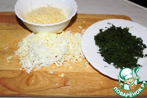 Натереть на мелкой терке сыр и яйцо, петрушку измельчить.