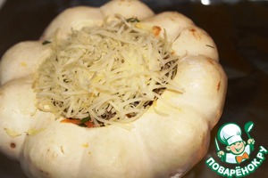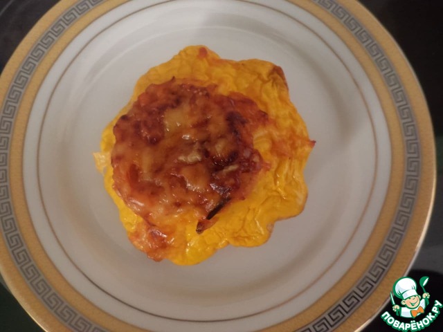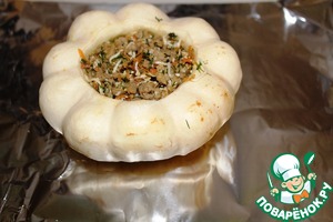 Я готовила из зрелых плодов, поэтому запекла их предварительно в духовке, разогретой до 200 градусов, приблизительно 30 минут. Если патиссоны молодые, время запекания можно сократить до 10 минут или отказаться от предварительного запекания совсем.
