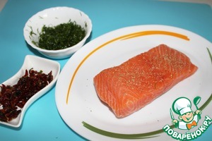 Укроп мою, сушу бумажным полотенцем и мелко нарезаю, перемешиваю с 3-мя ложками оливкового масла (я использовала масло, которым были залиты вяленые помидоры). Нарезаю мелко вяленые помидоры, кусок рыбного филе хорошенько солю и перчу со всех сторон.