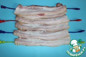 На рабочей поверхности раскладываю ломтики бекона так, чтобы получился прямоугольный пласт, я заранее проложила под беконом зажимы для фиксации (ломтики бекона очень нежные, рвущиеся).