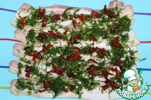 Смазываю беконовый пласт смесью оливкового масла с укропом, поверх - мелко нарезанные вяленые помидоры.