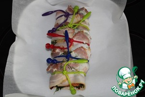 Заворачиваю рыбу в бекон и фиксирую зажимами (можно кулинарной нитью). У меня получилось нечто среднее, фиксатор все время отщелкивался, пришлось выкручиваться. В итоге, такая забавная картинка. Своеобразный рулет выкладываю на керамический противень, застеленный пергаментом.