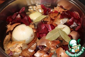 Готовим маринад. В кастрюльку наливаем 2 литра воды. Добавляем луковую шелуху, лавровый лист, 2 луковицы очищенные, перец горошком. Доводим до кипения и кипятим 10 минут.