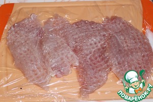 Куриную грудку нарезаем на тонкие пласты. Отбиваем. Я накрываю для этого его пленкой. И посыпаем обильно куркумой (или карри).