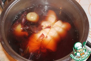 Берем кастрюлю побольше, кладем туда рульку, заливаем нашим маринадом. Кладем столовую ложку соли, ставим на огонь. Я варила 1,30 час на медленном огне, мне было достаточно, но вы смотрите, может понадобится и дольше. Если надо доливаем воду во время варки. Готовую рульку протыкаем острым ножом аккуратно, если выйдет чистый сок, то она готова.