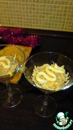 Салат подается в фужерчиках, можно есть слоеным, а можно перед употреблением немного перемешать. На ваш вкус.