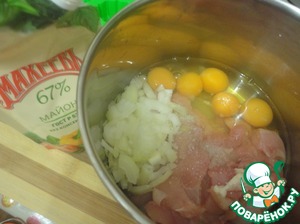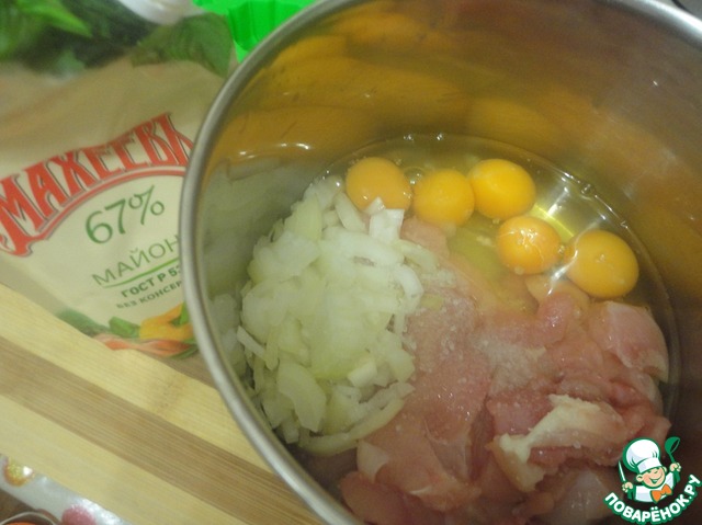 Филе курицы, лук нарезать, сложить в удобную ёмкость, добавить яйца.