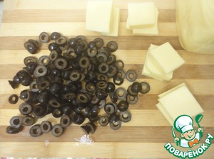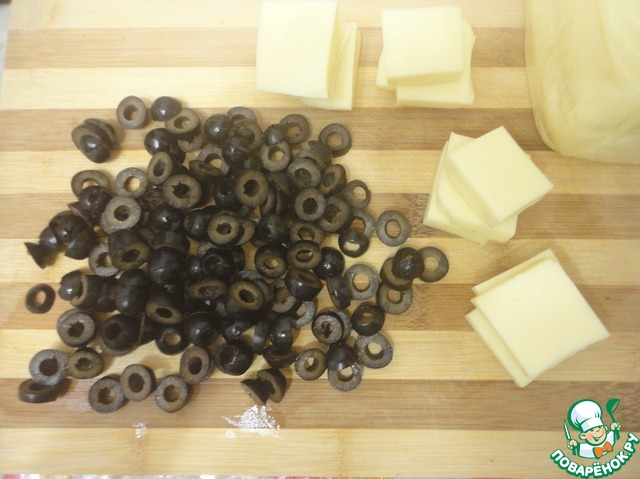 Отправляем в духовку на 10 минут, при температуре 180 гр. В это время с маслин слить жидкость и нарезать кольцами. Моцареллу нарезать небольшими квадратиками.