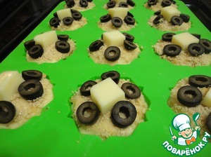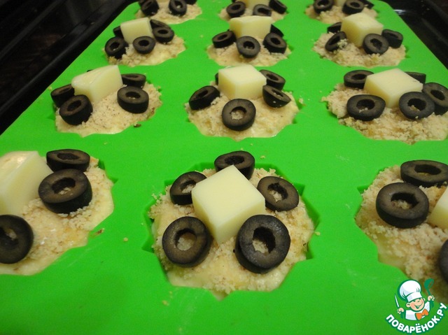 Через 10 минут вынимаем кексы и раскладываем на каждый по кусочку моцареллы и по 5 кружочков маслин. И снова на 10 минут в духовку.
