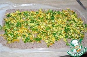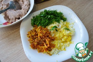 Зелень нарежьте. Добавьте обжаренные лук с морковью, перемешайте, посолите - начинка готова. -