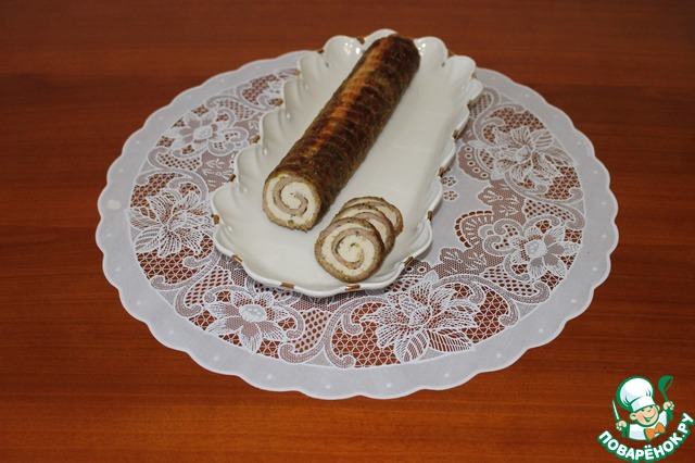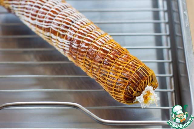 Как только рулет подрумянится, достаньте его, охладите и уберите в холод на 5-6 часов. Сетку снимите, когда рулет остынет.