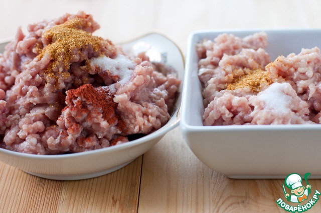 Филе курицы (вместе с кожей) и филе свинины пропустить дважды через мелкую решетку мясорубки, добавить в каждый фарш соль и сушеный чеснок. В свинину - 1 ч. л. паприки, для цвета. Влить в каждый фарш по 25 мл бульона. Тщательно вымесить каждый фарш, пока он не поглотит всю влагу и не загустеет. Закрыть фарш пленкой и убрать на маринование в холод на 4-6 часов.