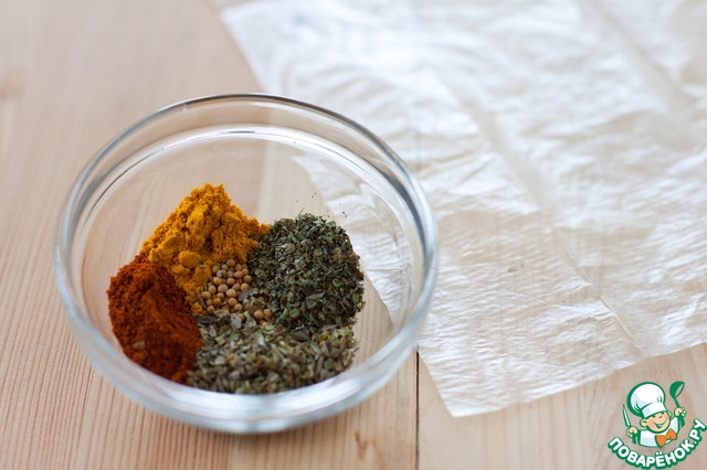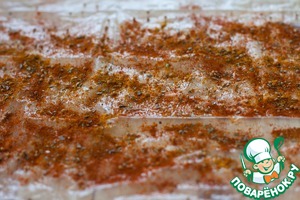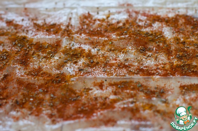 Отрезать два прямоугольника коллагеновой пленки, размером 30х45 см, смочить водой одну из них при помощи чистой губки, насыпать 1/2 всех специй -