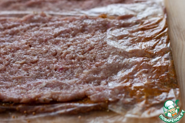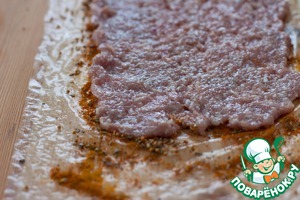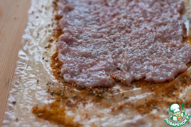 Положить второй лист пленки, повторить все операции - смочить, рассыпать специи, положить куриный фарш. На пленку со свиным фаршем положить пленку с куриным. С торца будущего рулета оба свободных конца пленки завернуть наверх.