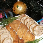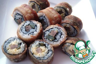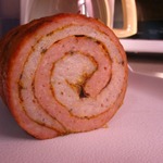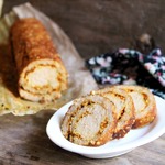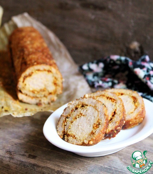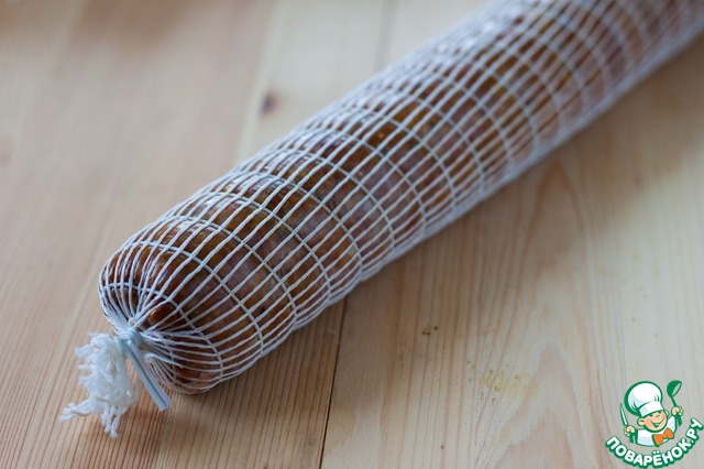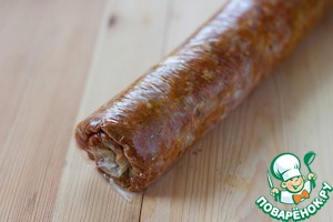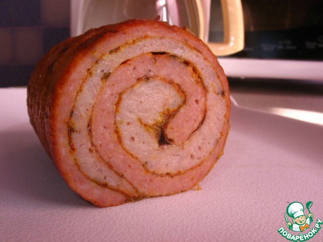 Для таких рулетов я использую пищевую коллагеновую пленку, это натуральный продукт, изготавливается из коллагена говяжьих шкур, является съедобным, при нагревании плавится и желируется, скрепляя между собой витки фарша со специями. Естественно, чем больше таких витков, тем эффектнее выглядит рулет в разрезе. Очень удобная штука, продается в интернет-магазинах.