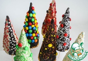 Готовые "елки" на палочках вставить в пазы решетки (от духовки/ для выпечки/ или другой подходящей), чтобы остатки шоколада могли свободно стечь. И в таком виде дать им окончательно застыть в холодильнике (на балконе).