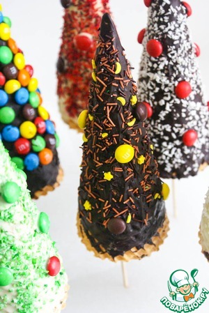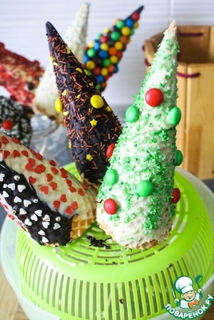 *Для "елок" понадобятся вафельные конусы, их можно купить или приготовить самостоятельно. У меня были покупные конусы от мороженого, широкого диаметра с неровным краем. Это не очень удобно. Для того чтобы с "елками" было проще работать, лучше поискать специальные кондитерские конусы с ровной нижней кромкой и не очень большого размера (7-10 см в высоту). -