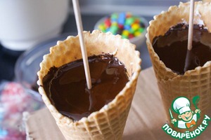 Растопить шоколад на водяной бане или в микроволновке. Разровнять и утрамбовать творожную массу и залить щедрым слоем растопленного шоколада. В данном случае шоколад закрепит начинку и не даст ей выпасть. В середину каждого наполненного и залитого шоколадом конуса вставить по палочке для мороженого/конфет или по деревянной шпажке для шашлыков.