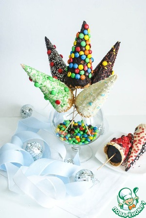Кондитерскую посыпку высыпать на широкую тарелку и обвалять обмазанные шоколадом конусы в ней/мелких конфетах или кокосовой стружке. Либо равномерно обсыпать конусы посыпкой, проворачивая его в руке над широкой тарелкой.