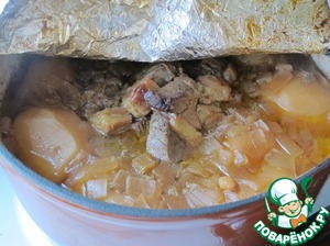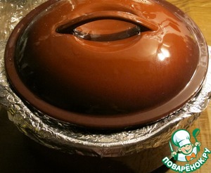 Накрыть сотейник фольгой, укрепив по краям. Сверху крышкой. В духовке в течение 30 минут довести шолет до кипения, после чего снизить температуру до 100*С и оставить кушанье на всю ночь до субботнего обеда в духовке. -