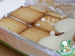 Приступаем к финальной стадии – сборке торта. На дно формы кладем слой печенья, сверху – щедрый слой крема, печенье – крем и так до упора. У меня получилось 5 слоев печенья. Если используете разъемную форму, то верхний слой – крем. Но так как у меня форма не разъемная, я планировала перевернуть торт вверх дном, поэтому верхний слой у меня – печенье. Убираем в холодильник. Дать торту постоять хотя бы ночь.