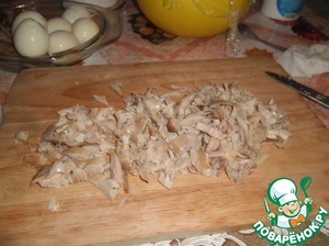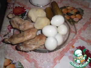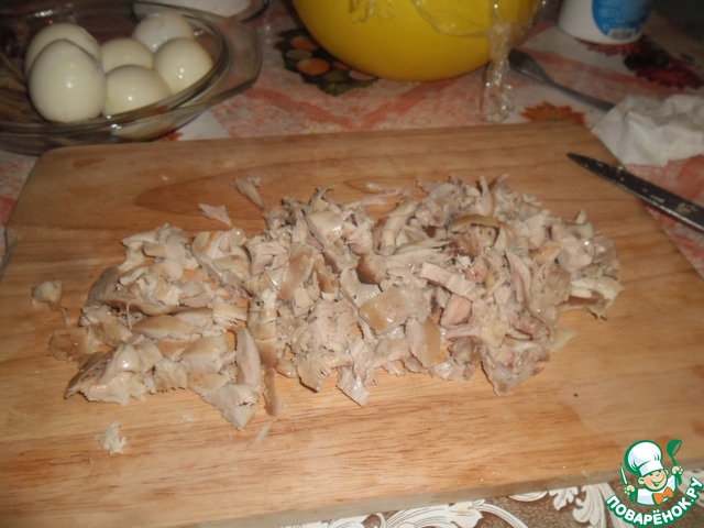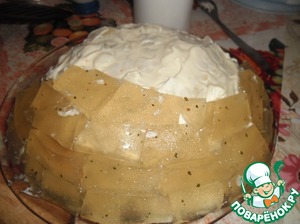 Желе можно приготовить заранее, чтобы оно застыло. Для этого нужно процедить куриный бульон (который у нас остался от куриного филе) через сито и добавить туда желатин (на 4 стакана бульона 3 ст. л. желатина), нагреть до растворения желатина при постоянном помешивании. Не доводить до кипения!