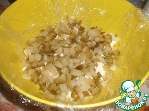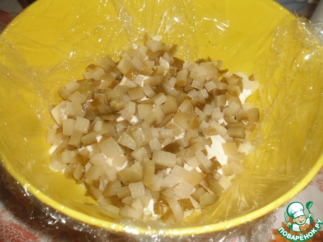 Также заранее маринуем лук в растворе воды с уксусом. -