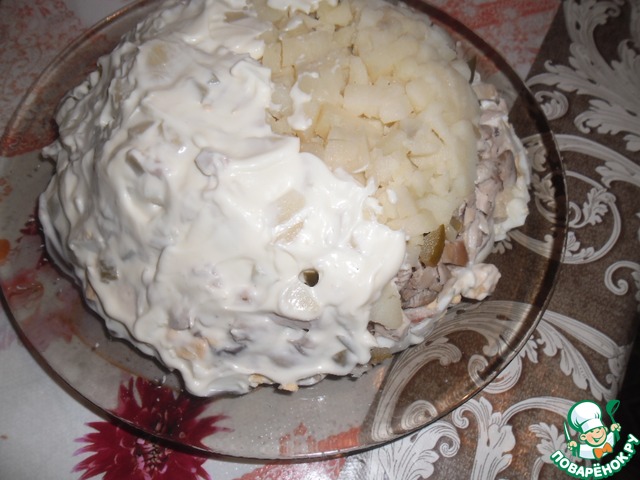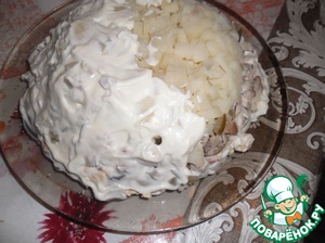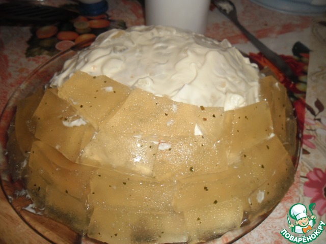 Достать салат, аккуратно перевернуть форму на блюдо и освободить от плёнки. Сверху и по бокам промазать майонезом