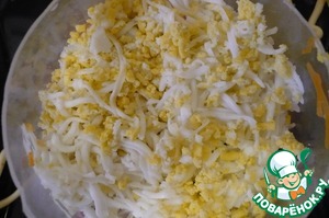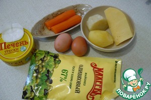 Картофель, морковь, яйца, сыр трем на мелкой терке. Печень вынуть, дать стечь маслу, режем мелкими кубиками.
