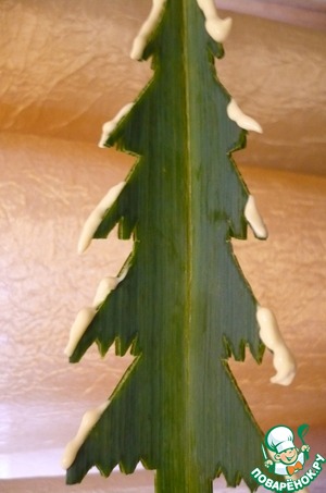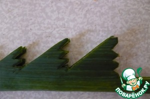 Теперь, когда салат стоит и пропитывается, делаем елочку. Для нее берем зеленый кусочек лука-порея, сложенный пополам. Ножницами (у меня только для этих целей простые маникюрные ножницы) вырезаем вот такую заготовку.