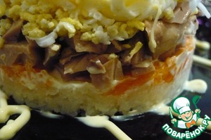 Теперь морковь, смазываем майонезом, а на нее кусочки печени. Ее мы не смазываем, чтобы когда будем есть салат, она оставалась кусочками.