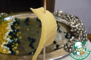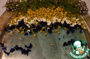 • После того как все застыло, начинаем формировать волны. Сначала вилкой перемешиваем белую майонезную массу до мелкой массы. Темно-синюю режем в мелкие кубики. И по краю кукурузы, где заканчивается вода, волнообразно наносим белые крошки. За ними синюю волну.