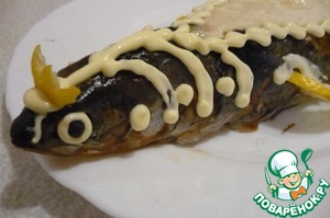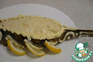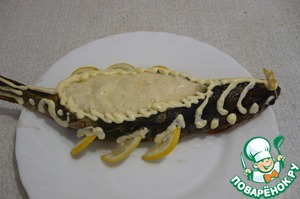 • Рыбу кладем на блюдо, промазываем полностью бальзамической смесью и убираем застывать. После этого делаем косые надрезы и вставляем туда полоски лимона. Они изображают весла. Из корки вырезаем маленькую корону.