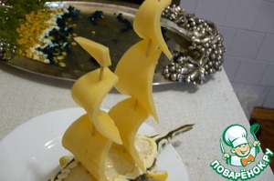 • Переносим рыбу на воду и устанавливаем мачты. Если Вы делаете большую, то украшать надо сразу на блюде. Готовая.