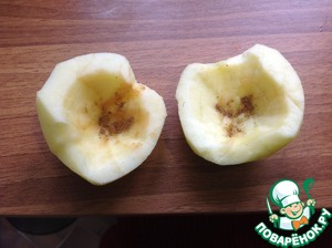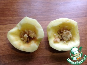 Яблоки очистить от кожуры, разрезать пополам и аккуратно вырезать сердцевинку, орехи не очень мелко прокатать скалкой