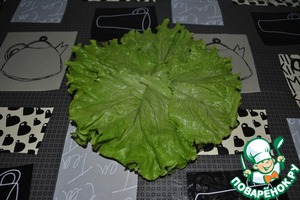 Листья салата ополоснуть, выложить на плоскую сервировочную тарелку.