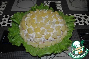 1 слой: Выложить половину нарезанной курицы на листья салата.