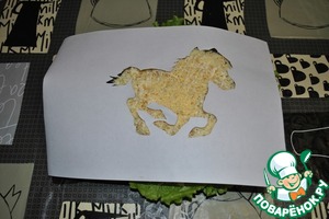 Начинаем украшать салатик. Вырезаем контур лошади из бумаги.