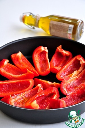 Переложить в форму для запекания, сбрызнуть оливковым маслом. Запечь при 200* до готовности. Я готовила минут 20 до легких подпалин, затем поместила перец в плотный полиэтиленовый мешок на 15 минут, это поможет легко очистить кожицу.