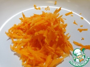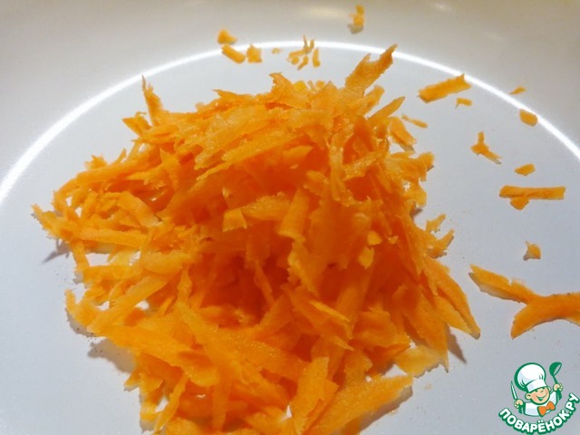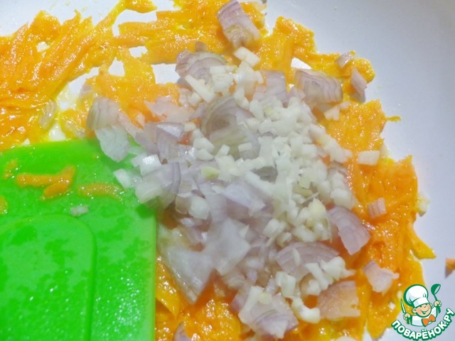 Разогреваем сковороду с добавлением растительного масла. Выкладываем морковь. Помешиваем. Через 5 минут добавляем лук и чеснок. Перемешиваем.