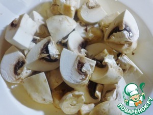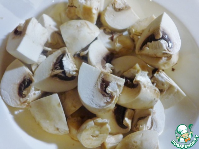 Разрезаем пополам или на 4 части шампиньоны. Выкладываем в миску.