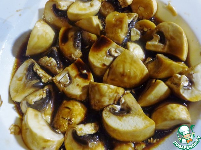 Добавляем лимонный сок, соевый соус, оливковое масло и сахар. Поперчим. Перемешиваем. Заливаем грибы. Даем промариноваться 3-4 минуты.