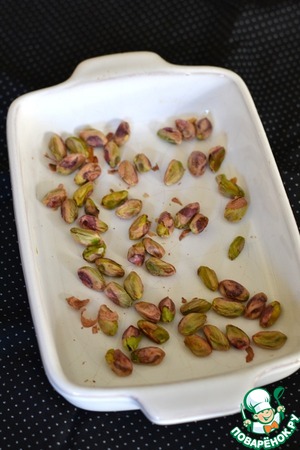 Если вы взяли не жареные фисташки, то проколите их в духовке 8-10 мин. при 180 град., чтобы их вкус был насыщенный, а также так будет легче снять шелуху.