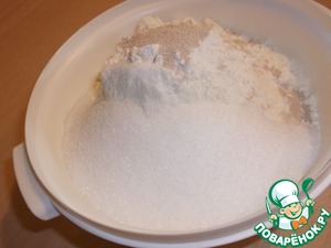 Муку, дрожжи, соль, 40 г сахара перемешаем.