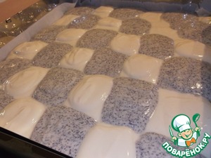 Теперь, вооружившись двумя ложками, чередуя обе начинки, распределяем её по всей поверхности теста.