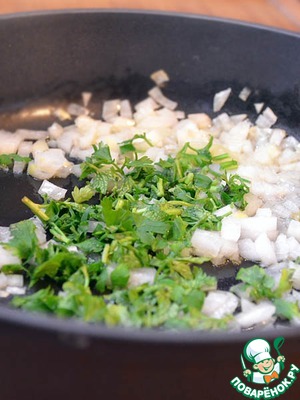 В сковороде разогреваем масло. Слегка обжариваем мелко нарезанные лук и петрушку.