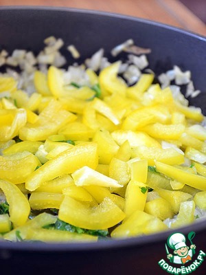 Добавляем в сковороду перец, нарезанный небольшими полосками, около 50 мл бульона, приправляем солью и молотым черным перцем, закрываем крышкой.