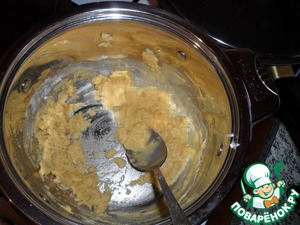 Когда масло растопится, при постоянном помешивание понемногу вводим муку. Должна получиться густая паста без капли масла.