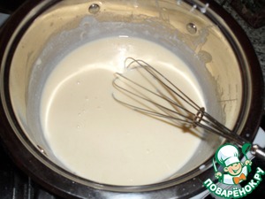 Понемногу, при постоянном помешивании, добавляем молоко. Комочков быть не должно. Мешаем 1-2 минуты до загустения.