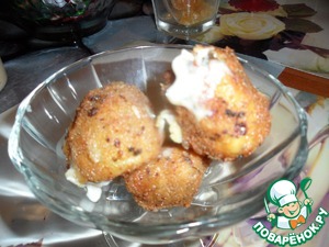 Лепим колбаску или шарики, как у меня. У Оливера фотка, конечно, очень аккуратная. Но он Шеф-повар, а я просто готовить люблю. Поэтому у меня получилось гораздо более непрезентабельно. Обваливаем наши крокеты сначала в муке, потом в яйце и напоследок в сухарях. -